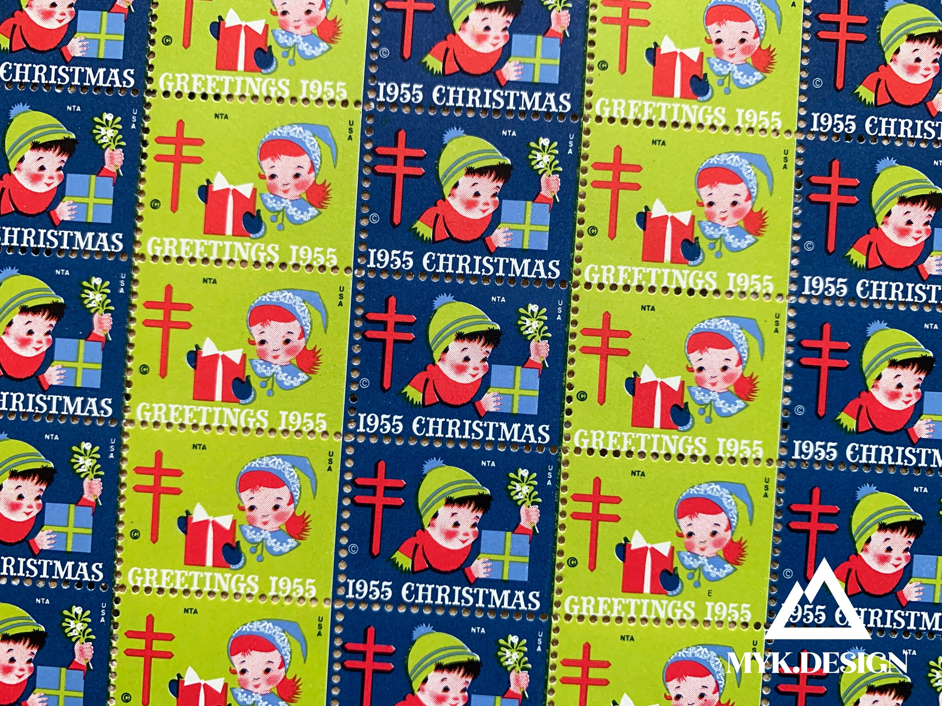 Most Christmas seal sheets were folded and mailed when originally purchased, and thus the perforations between columns are weak or even separating. This is rather common on older Christmas seal sheets. All of the sheets present well (for framing, for example) and will be shipped flat, but expect some separation between some of the columns or rows. A few of the seals in the set may have dry gum or may be missing gum and will need a touch of a glue stick. Most of the seals will have full gum on the reverse and a quick dab of a moist sponge should be all they need.