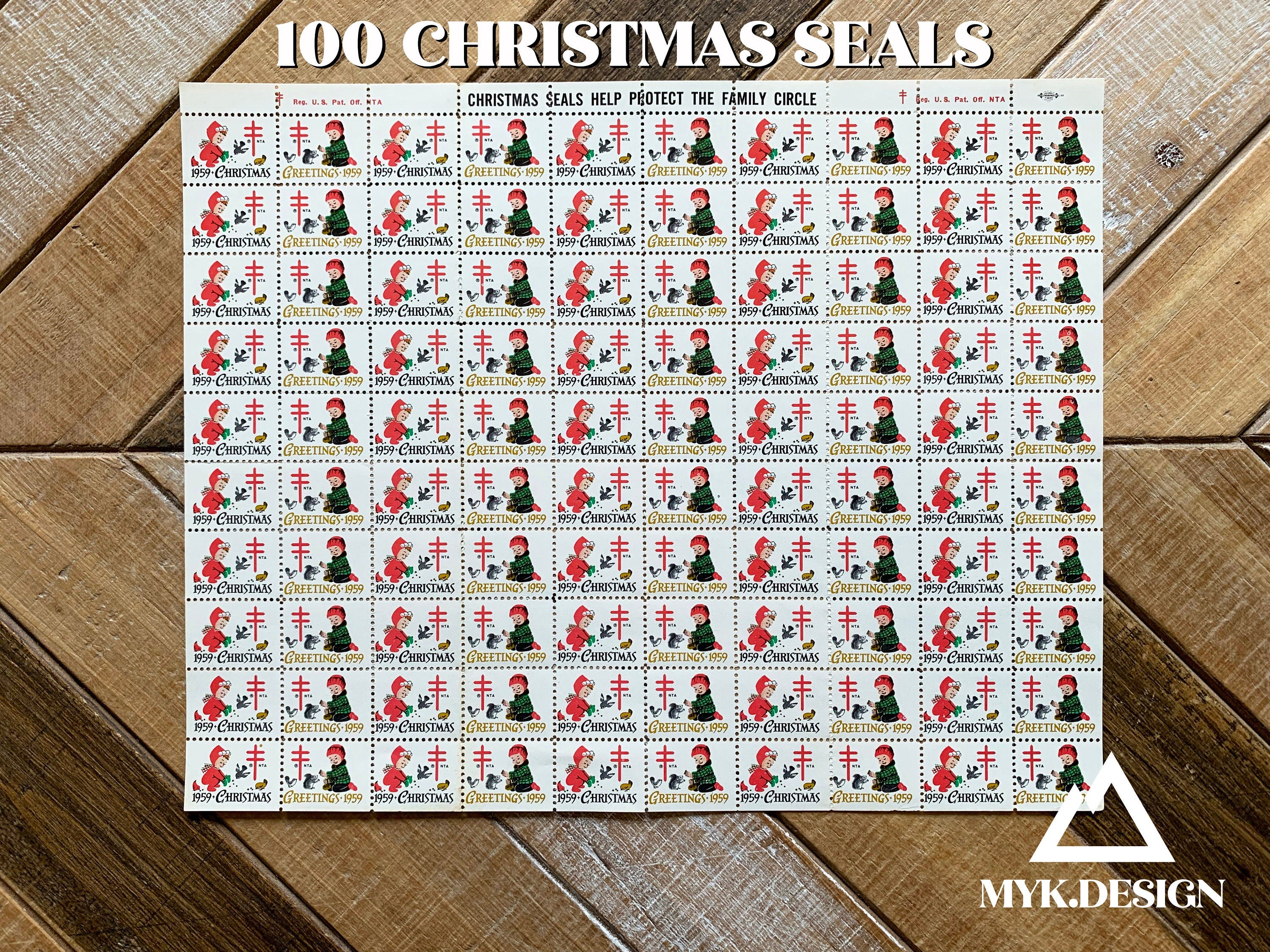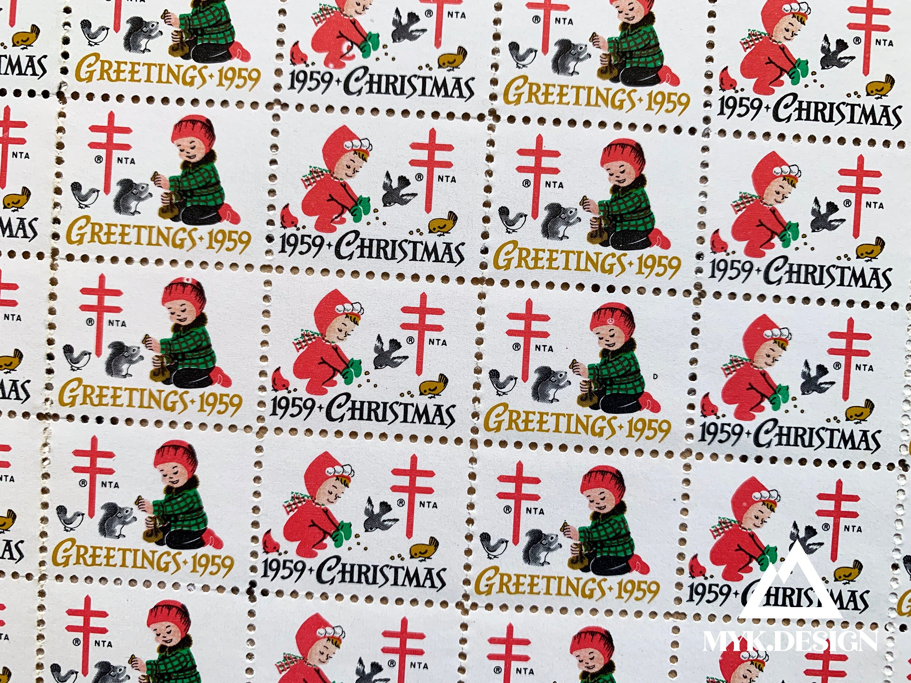 Most Christmas seal sheets were folded and mailed when originally purchased, and thus the perforations between columns are weak or even separating. This is rather common on older Christmas seal sheets. All of the sheets present well (for framing, for example) and will be shipped flat, but expect some separation between some of the columns or rows. A few of the seals in the set may have dry gum or may be missing gum and will need a touch of a glue stick. Most of the seals will have full gum on the reverse and a quick dab of a moist sponge should be all they need.