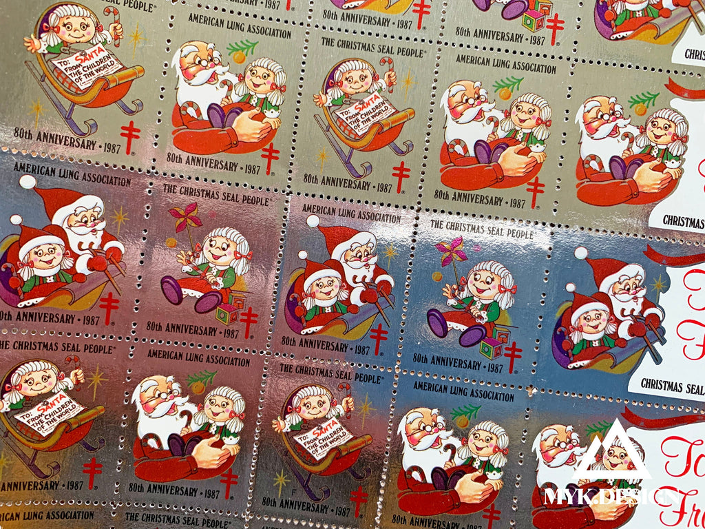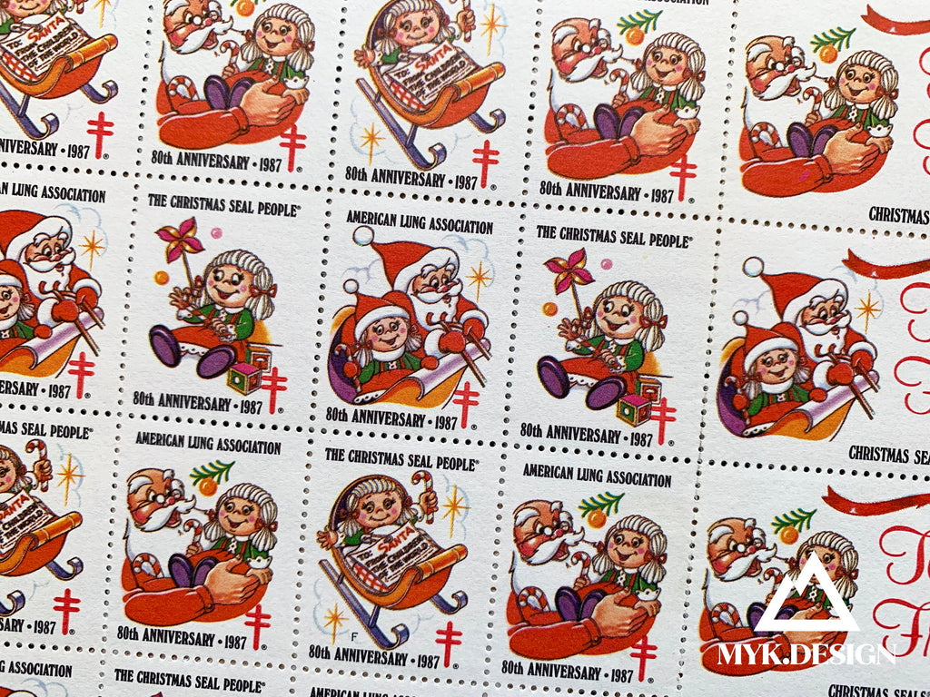 First issued in 1907, Christmas seals were championed by Emily Bissel with the help of the National Association for the Study and Prevention of Tuberculosis (NASPT) and the American Red Cross. They were initially printed and sold to raise money to fight tuberculosis. Now printed by the American Lung Association (which the NASPT became in 1973), the seals are still sold today to raise money for respiratory illnesses.