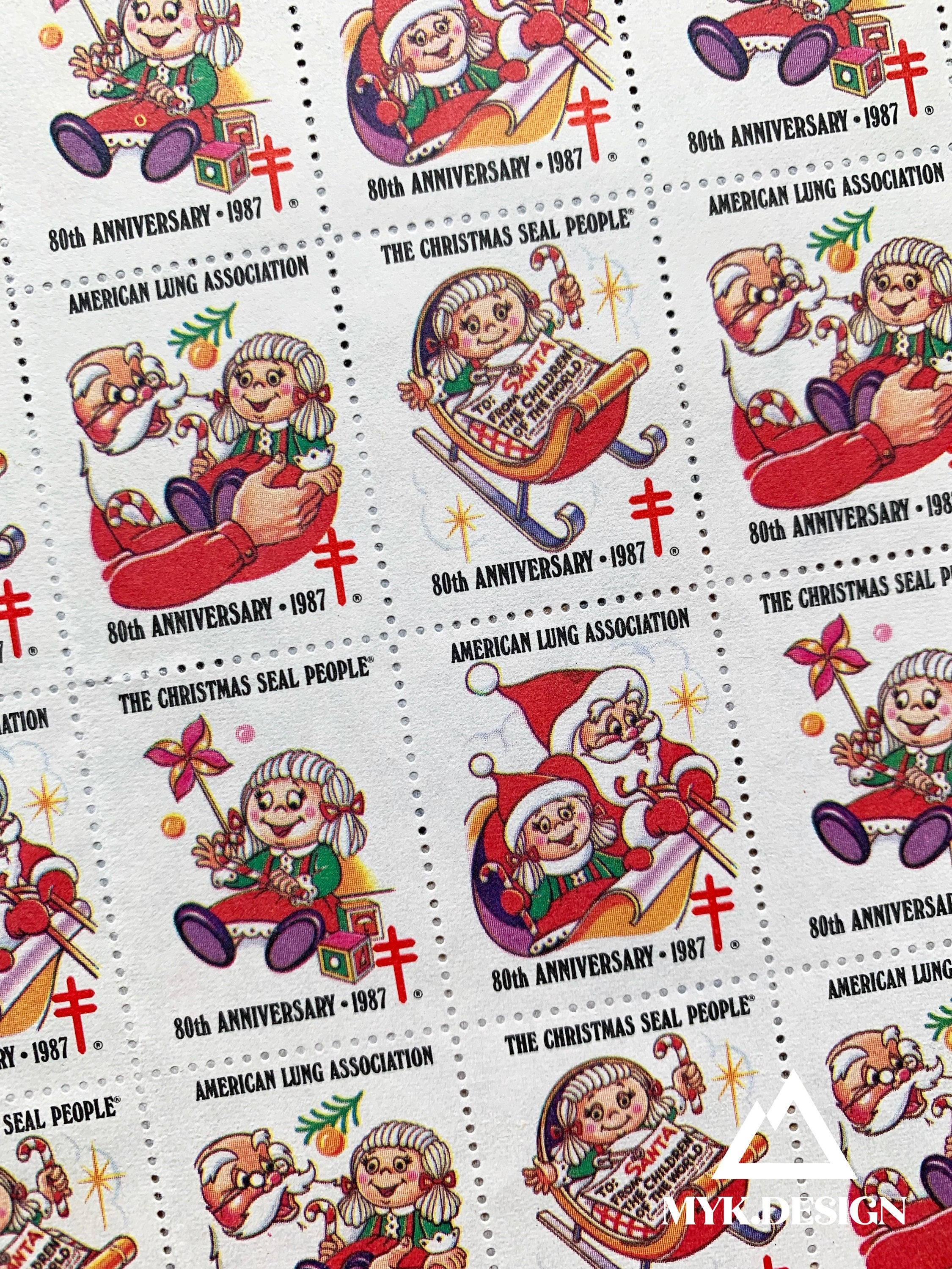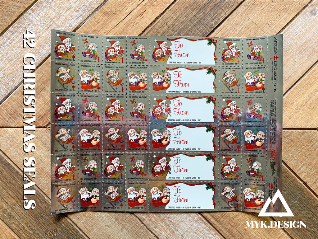Most Christmas seal sheets were folded and mailed when originally purchased, and thus the perforations between columns are weak or even separating. This is rather common on older Christmas seal sheets. All of the sheets present well (for framing, for example) and will be shipped flat, but expect some separation between some of the columns or rows. A few of the seals in the set may have dry gum or may be missing gum and will need a touch of a glue stick. Most of the seals will have full gum on the reverse and a quick dab of a moist sponge should be all they need.