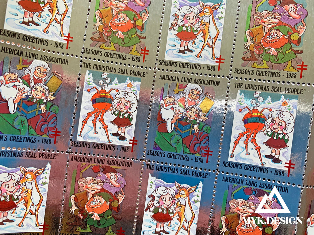 Most Christmas seal sheets were folded and mailed when originally purchased, and thus the perforations between columns are weak or even separating. This is rather common on older Christmas seal sheets. All of the sheets present well (for framing, for example) and will be shipped flat, but expect some separation between some of the columns or rows. A few of the seals in the set may have dry gum or may be missing gum and will need a touch of a glue stick. Most of the seals will have full gum on the reverse and a quick dab of a moist sponge should be all they need.