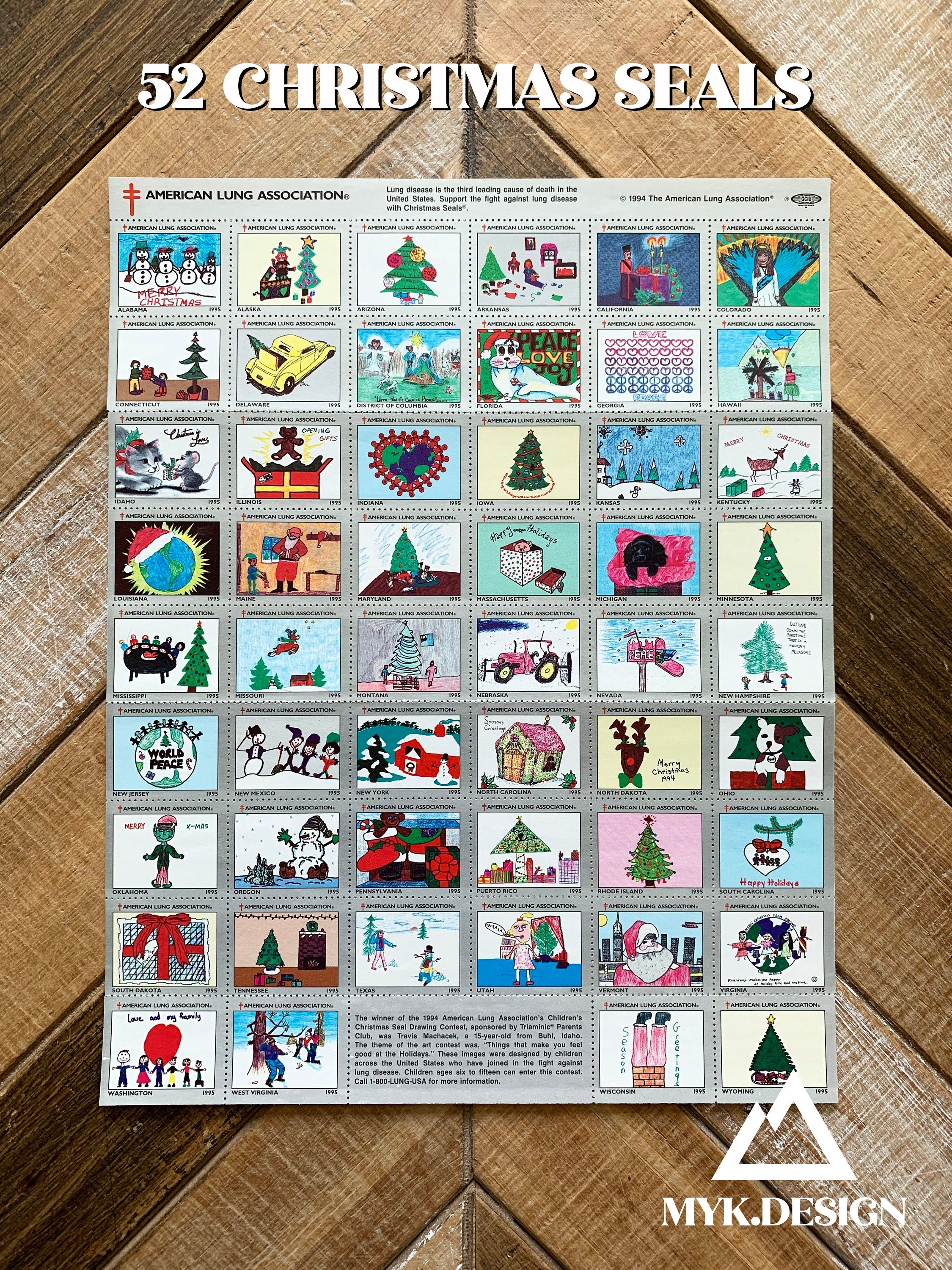 Most Christmas seal sheets were folded and mailed when originally purchased, and thus the perforations between columns are weak or even separating. This is rather common on older Christmas seal sheets. All of the sheets present well (for framing, for example) and will be shipped flat, but expect some separation between some of the columns or rows. A few of the seals in the set may have dry gum or may be missing gum and will need a touch of a glue stick. Most of the seals will have full gum on the reverse and a quick dab of a moist sponge should be all they need.