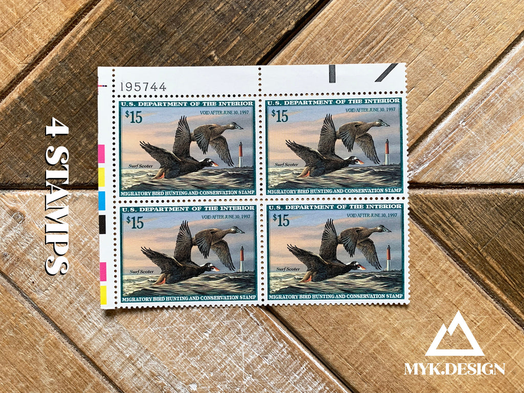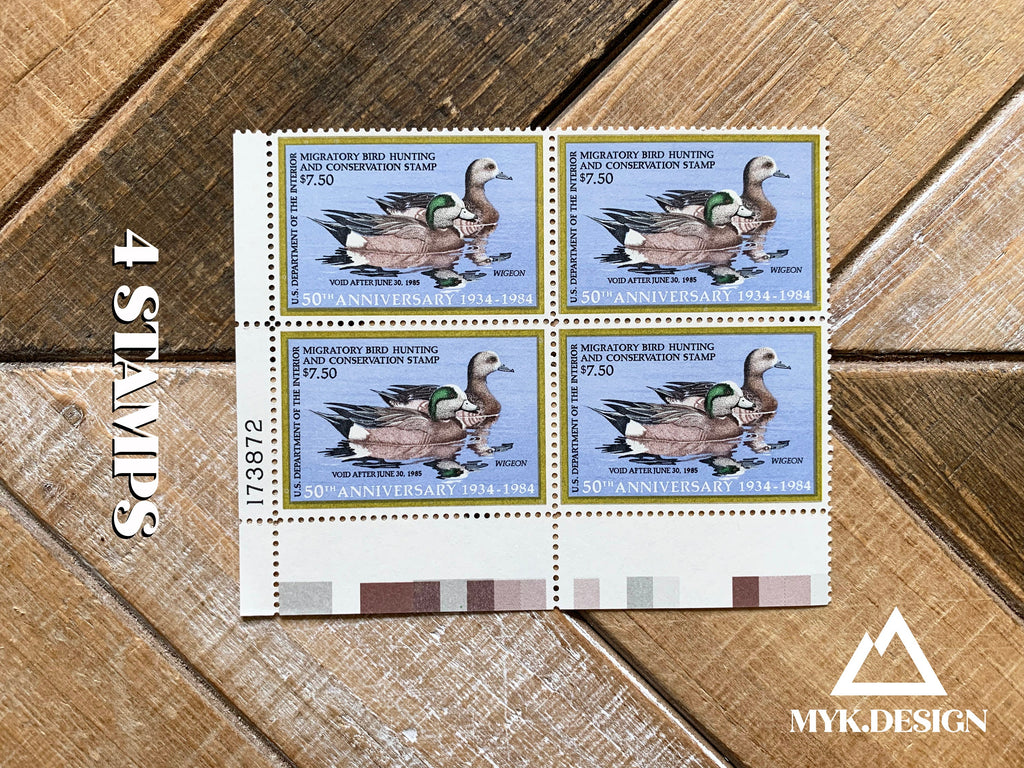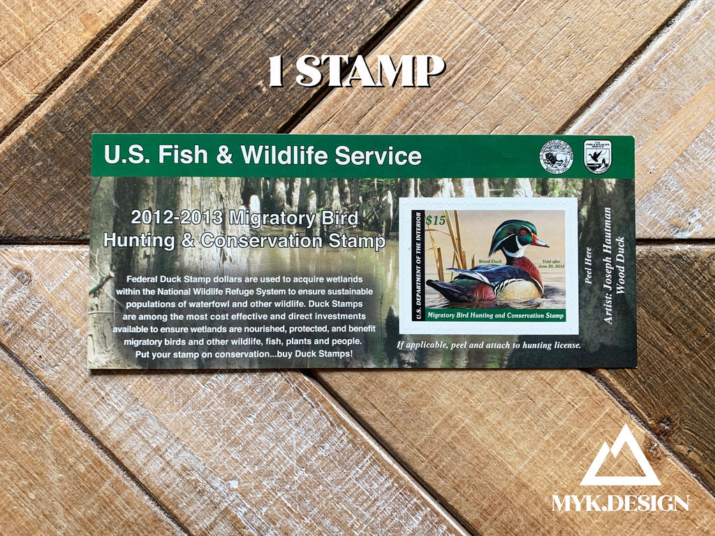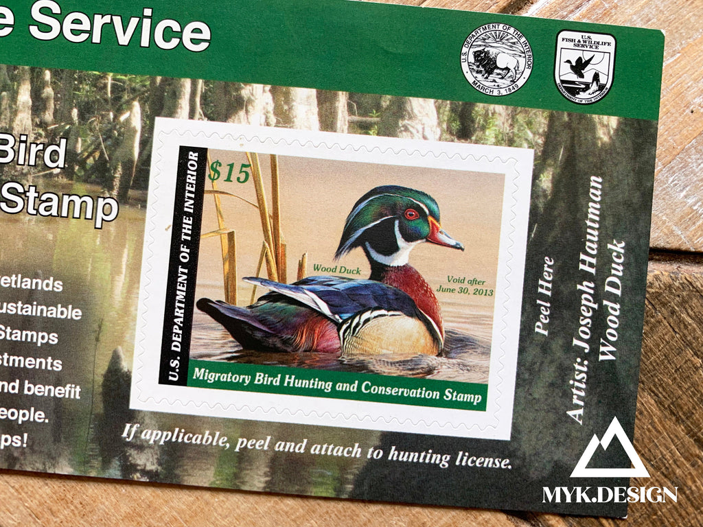 Hunting permit stamps (duck stamps) were first issued in 1934 and required to be affixed to a hunting license or to gain entry to some National Wildlife Refuges.  The revenue generated goes back into preservation and protection, and the duck stamp program is widely regarded as one of the most successful programs in conservation in existence.  (Duck stamps are not good for postage on mail.)