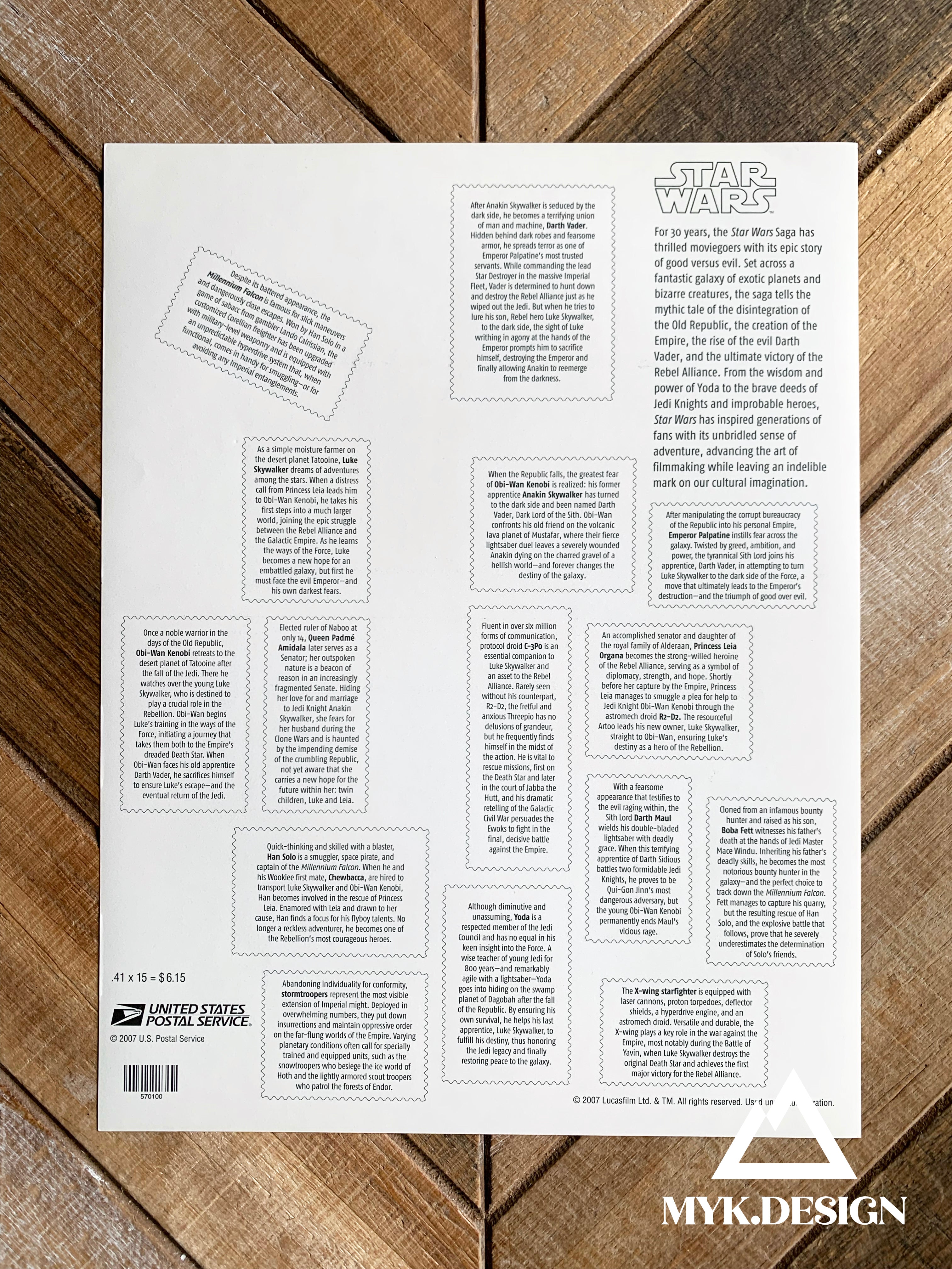 Star Wars: Darth Vader, Millennium Falcon, Palpatine, Skywalker, Obi-Wan Kenobi, C-3PO, Chewbacca, Han Solo | U.S. Postage Stamps | Face Value 41 Cents | 2007 | Scott 4143