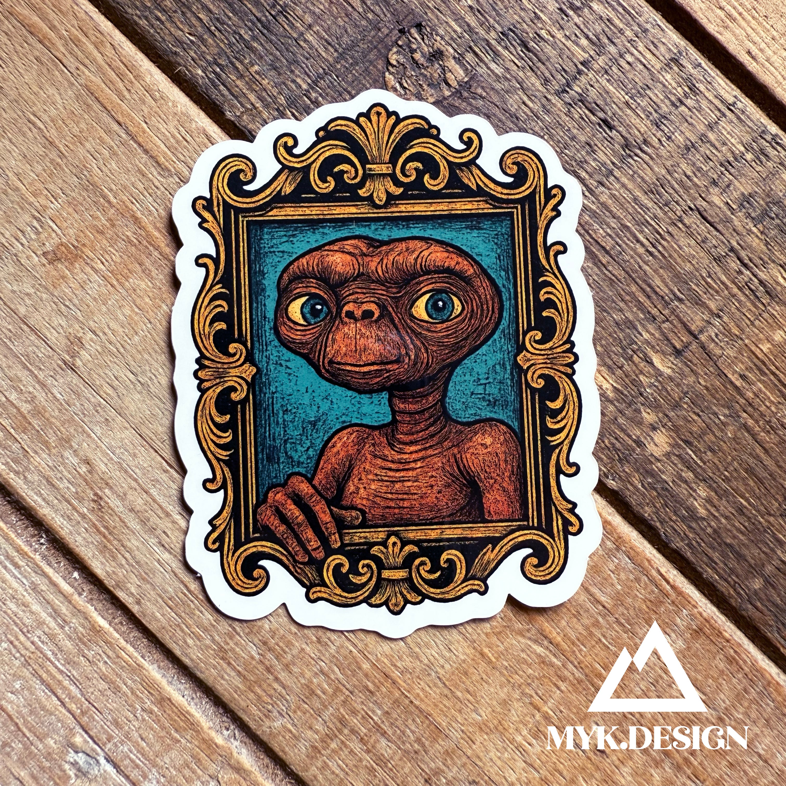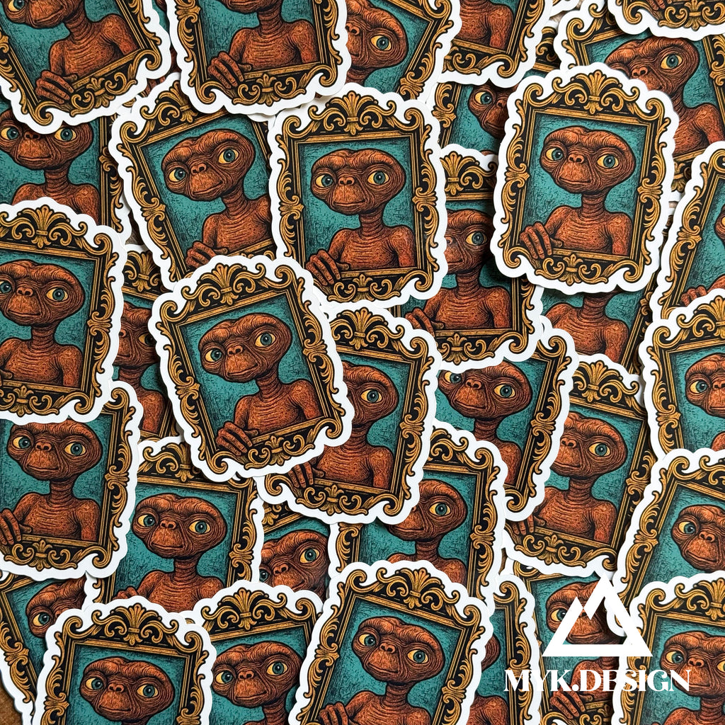 If you ever dreamed of flying past the moon on a bike or building a communicator out of a Speak & Spell, this one’s for you. E.T. is the lovable little legend who made an entire generation cry, call their mom, and check the closet for glowing aliens. E.T. may be from another planet, but he’s been living rent-free in our hearts since the ‘80s. This isn’t just a sticker—it’s a movie night, a moonlit bike ride, and a lump in your throat all rolled into one. E.T. is here to remind you of childhood magic, quiet goodbyes, and the kind of friendship that can stretch across galaxies (and your lunchbox).