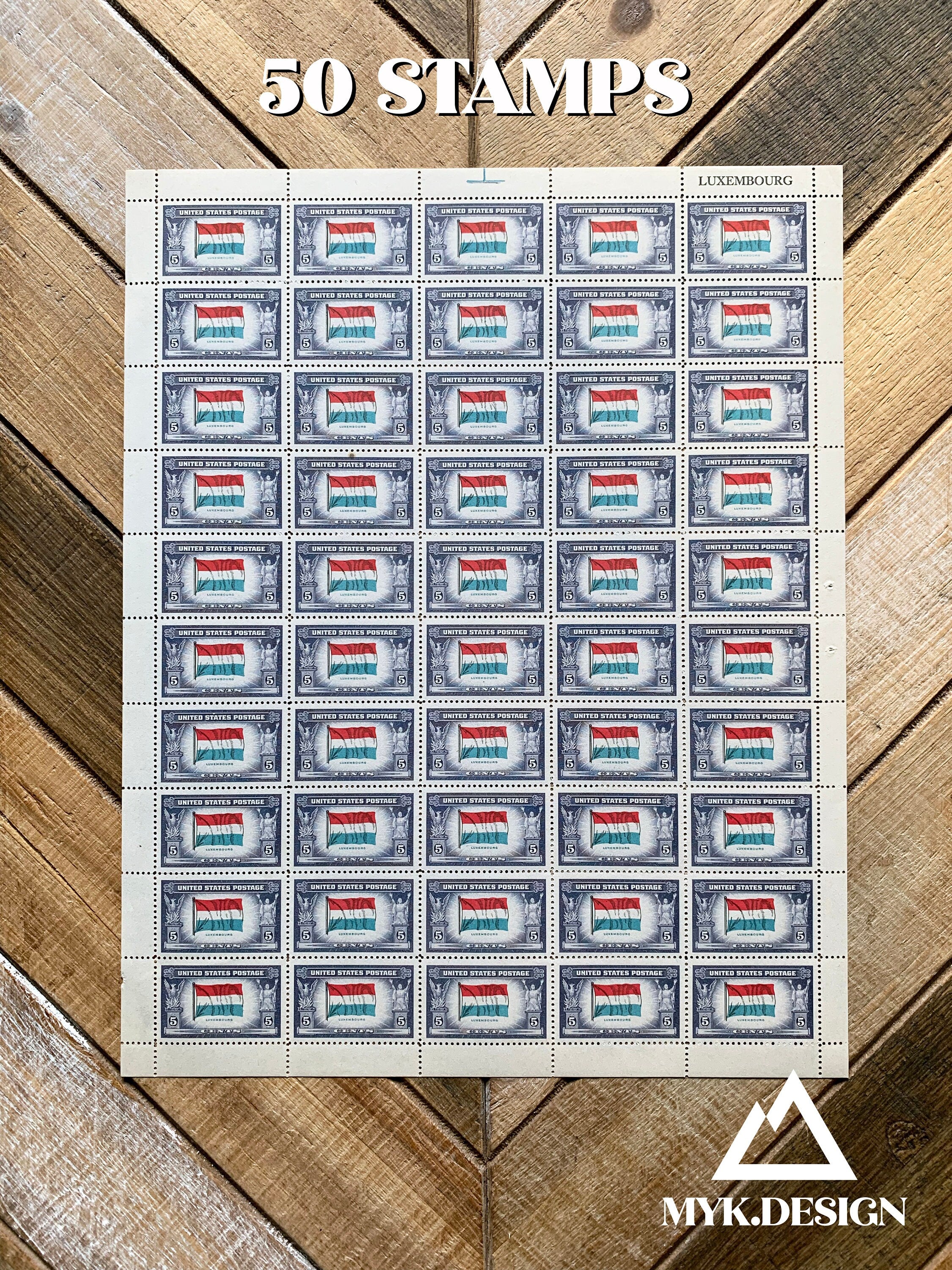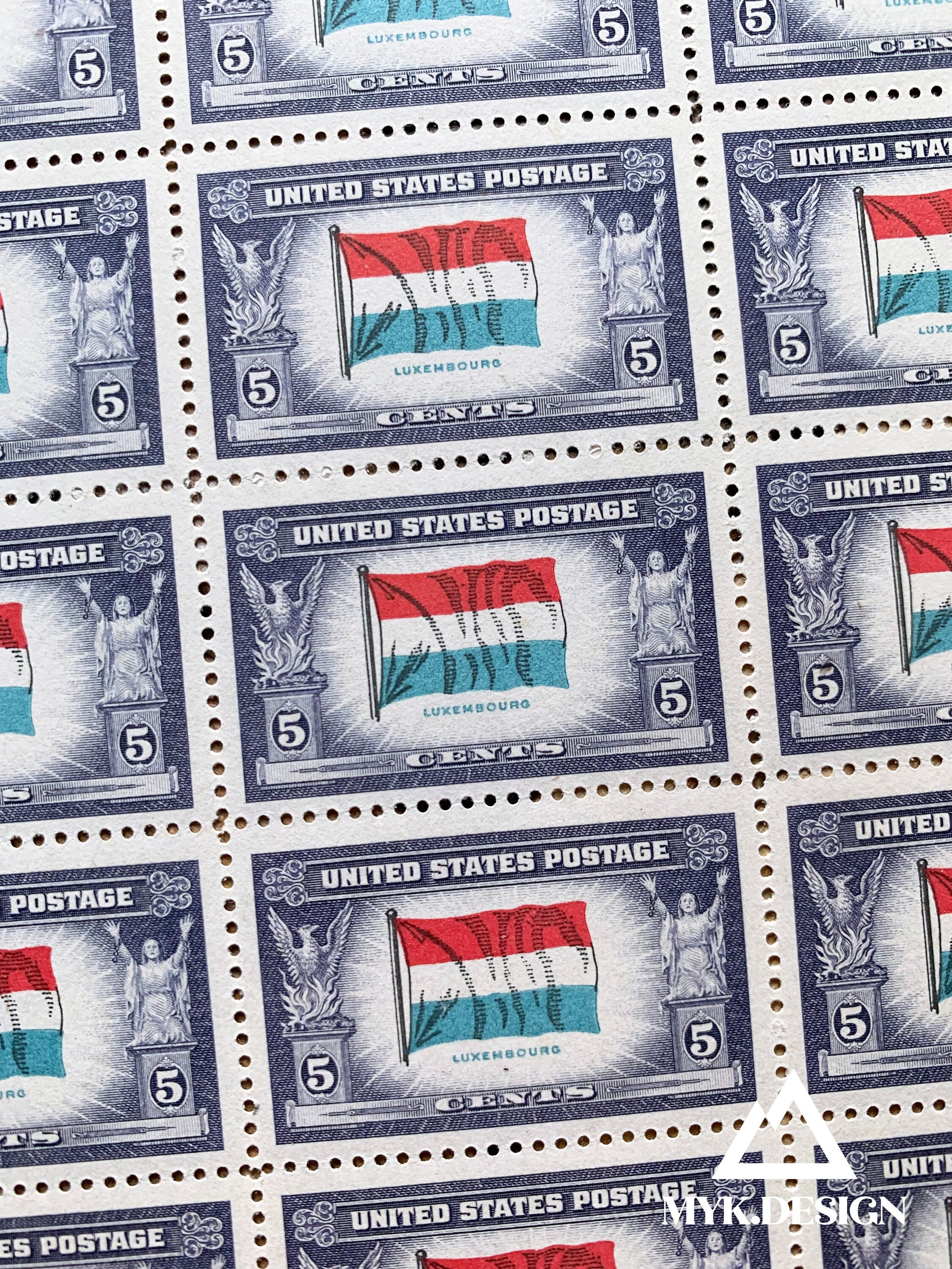 Overrun Countries: Flag of Luxembourg Sheet of 50 U.S. Postage Stamps | Face Value 5 Cents | 1943 | Scott 912