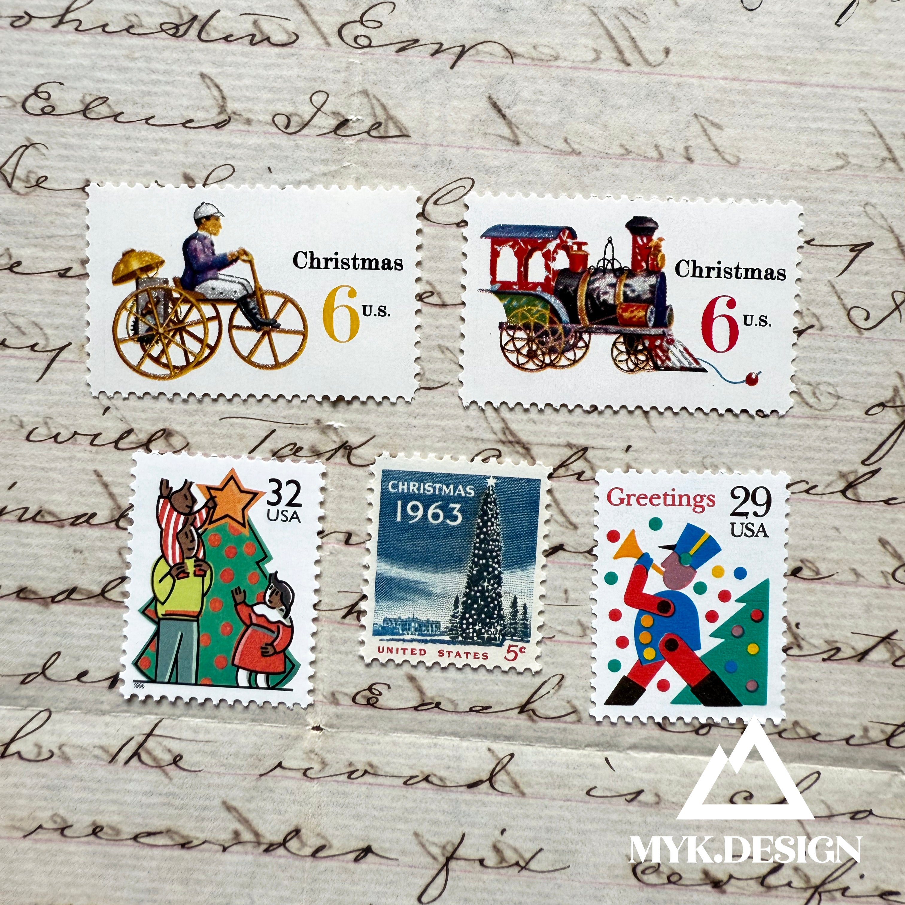 Vintage Christmas Postage Set of Five Stamps | 78 cents postage for cards, letters | Christmas Trees, Toys
