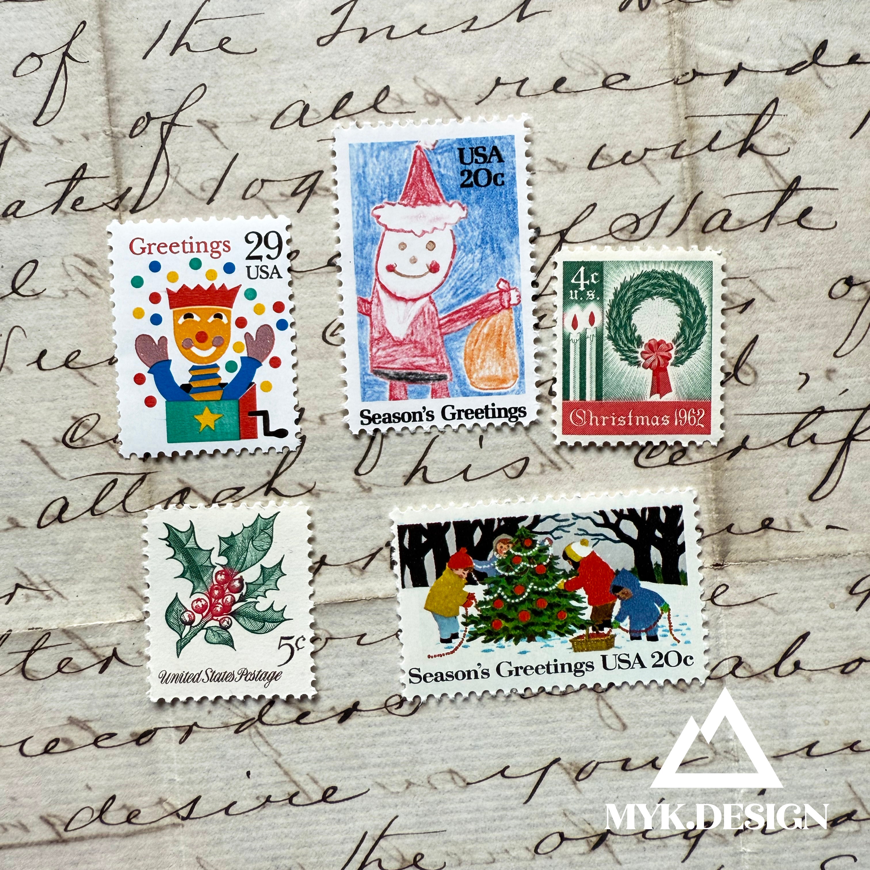 Vintage Christmas Postage Set of Five Stamps | 78 cents postage for cards, letters | Santa and Christmas Tree