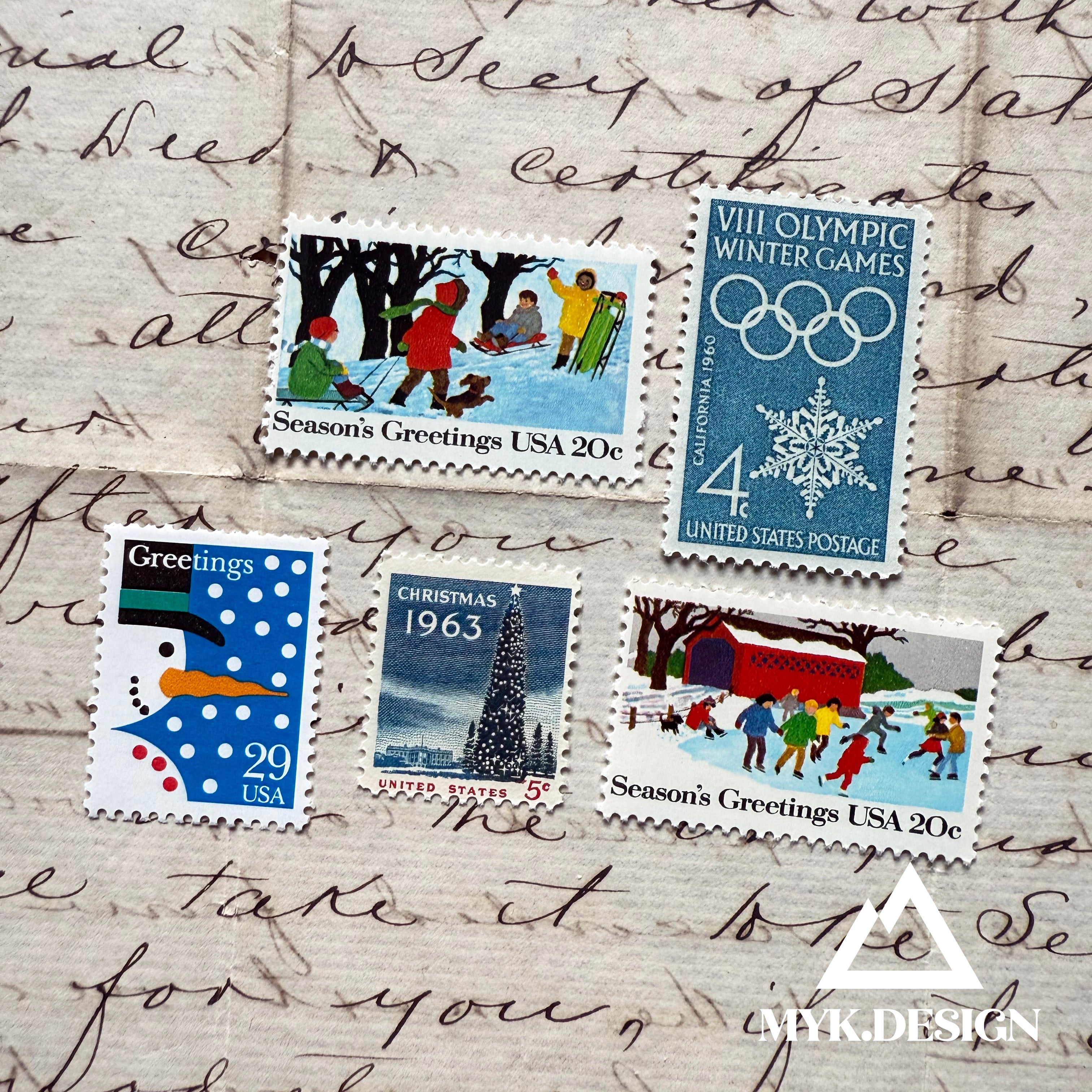 Vintage Christmas Postage Set of Five Stamps | 78 cents postage for cards, letters | Winter Scenes