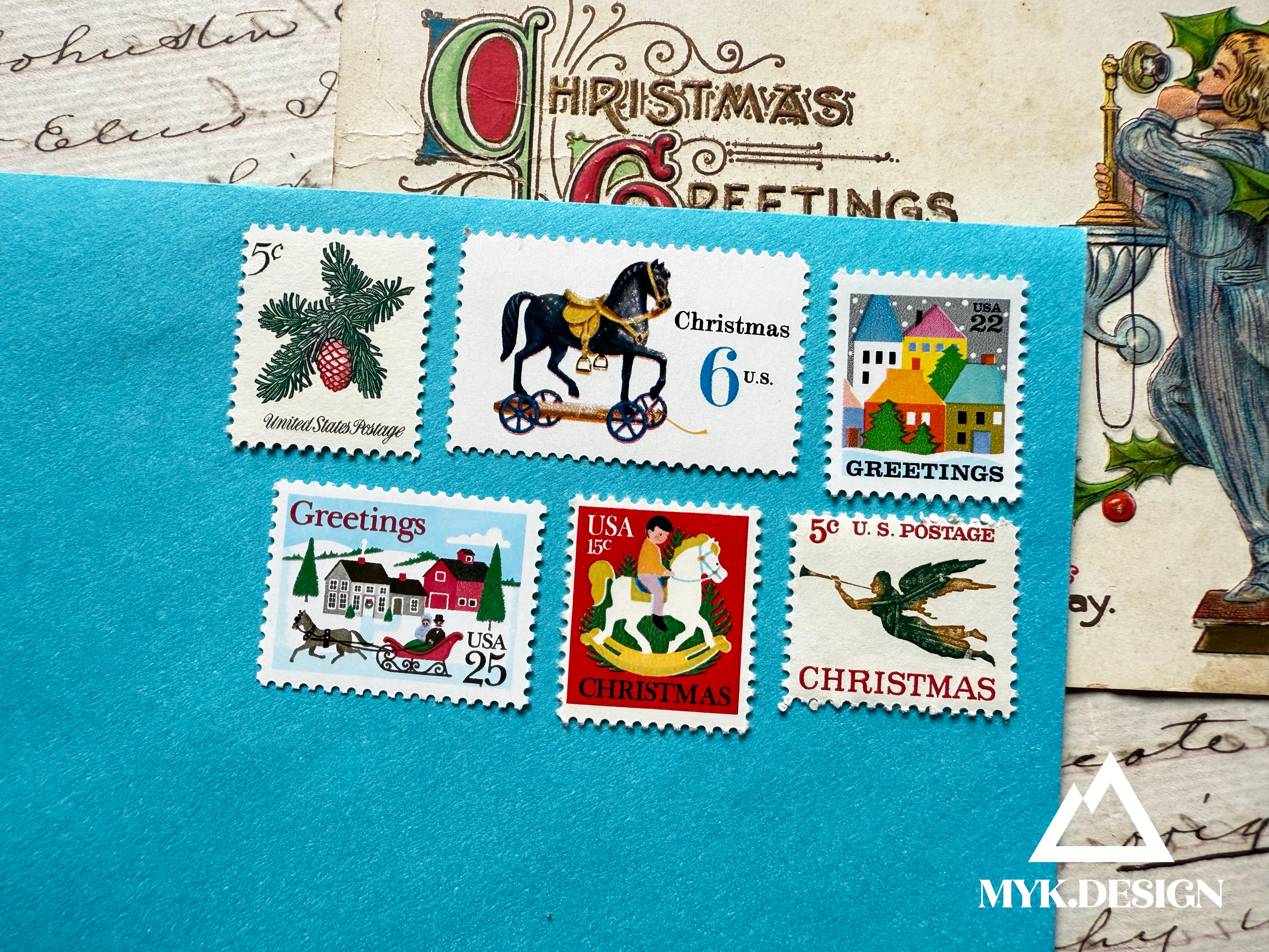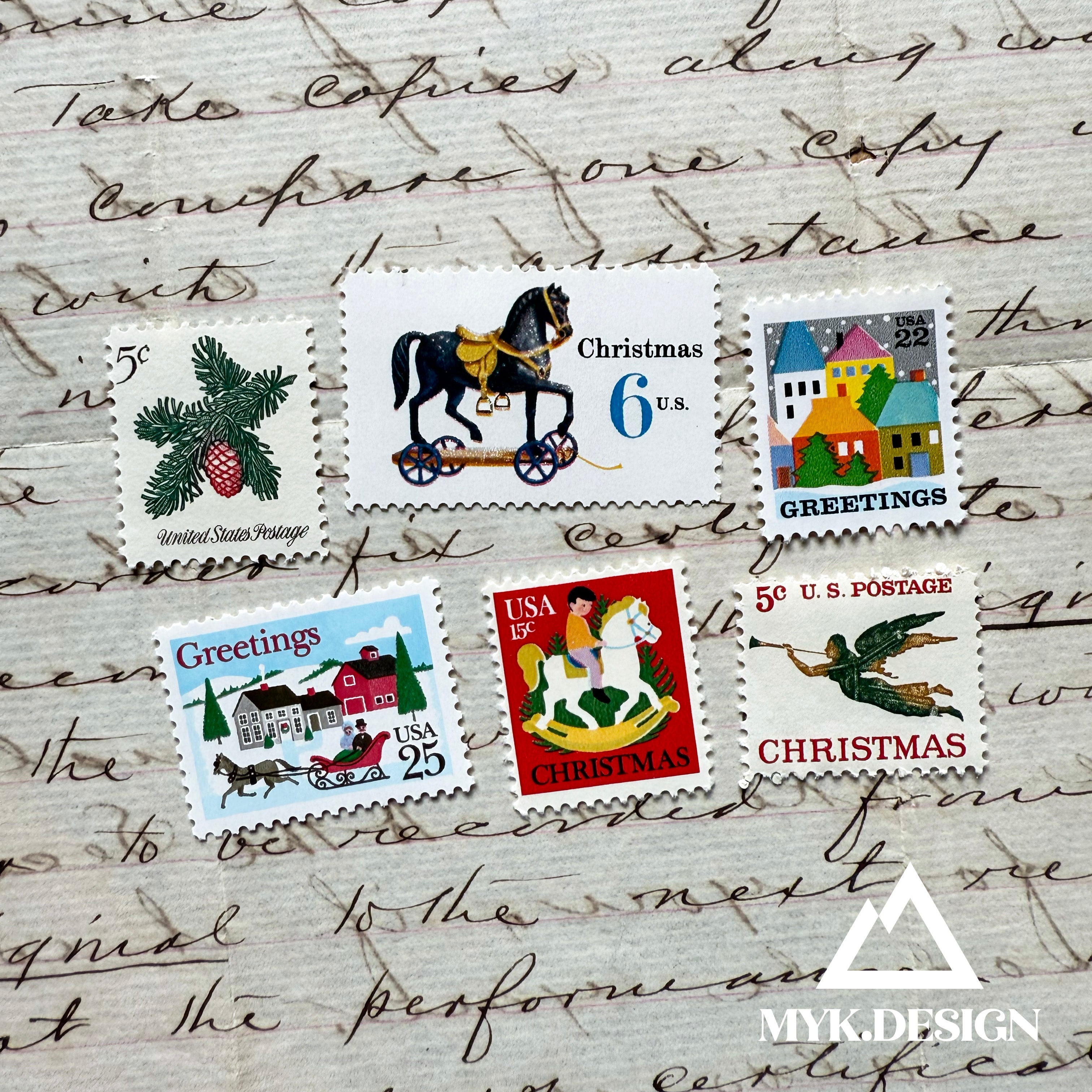 Vintage Christmas Postage Set of Six Stamps | 78 cents postage for cards, letters | Winter Village, Horses